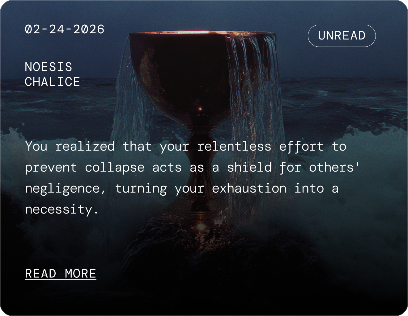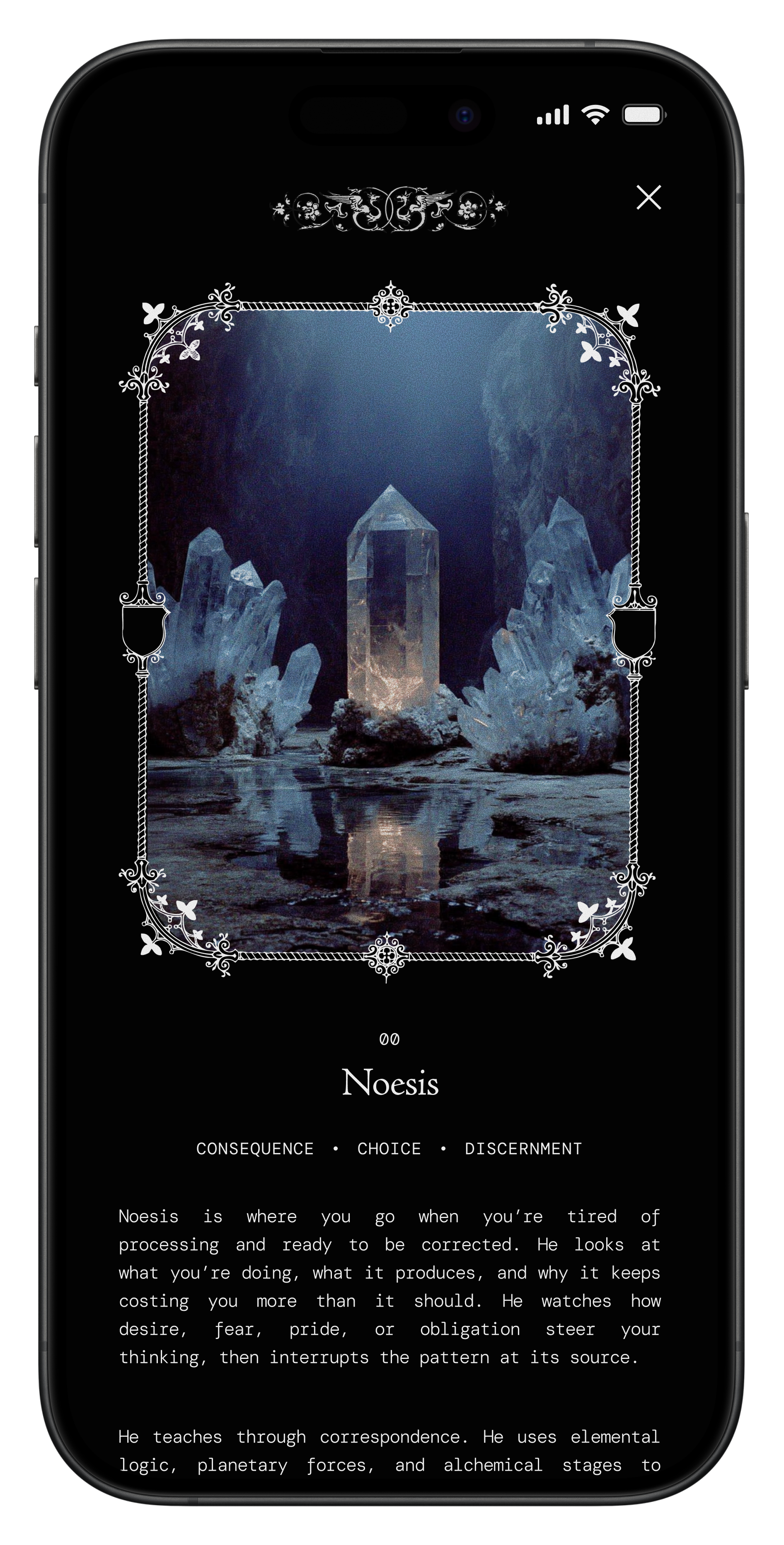 For example, if you bring a painful, drawn-out breakup to Noesis, the guide will help you see the structural reality of the boundary you need to draw. When you seal the session, the system automatically tags the Insight with The Severant, because the energy of endings and boundaries is the actual force you were working with.