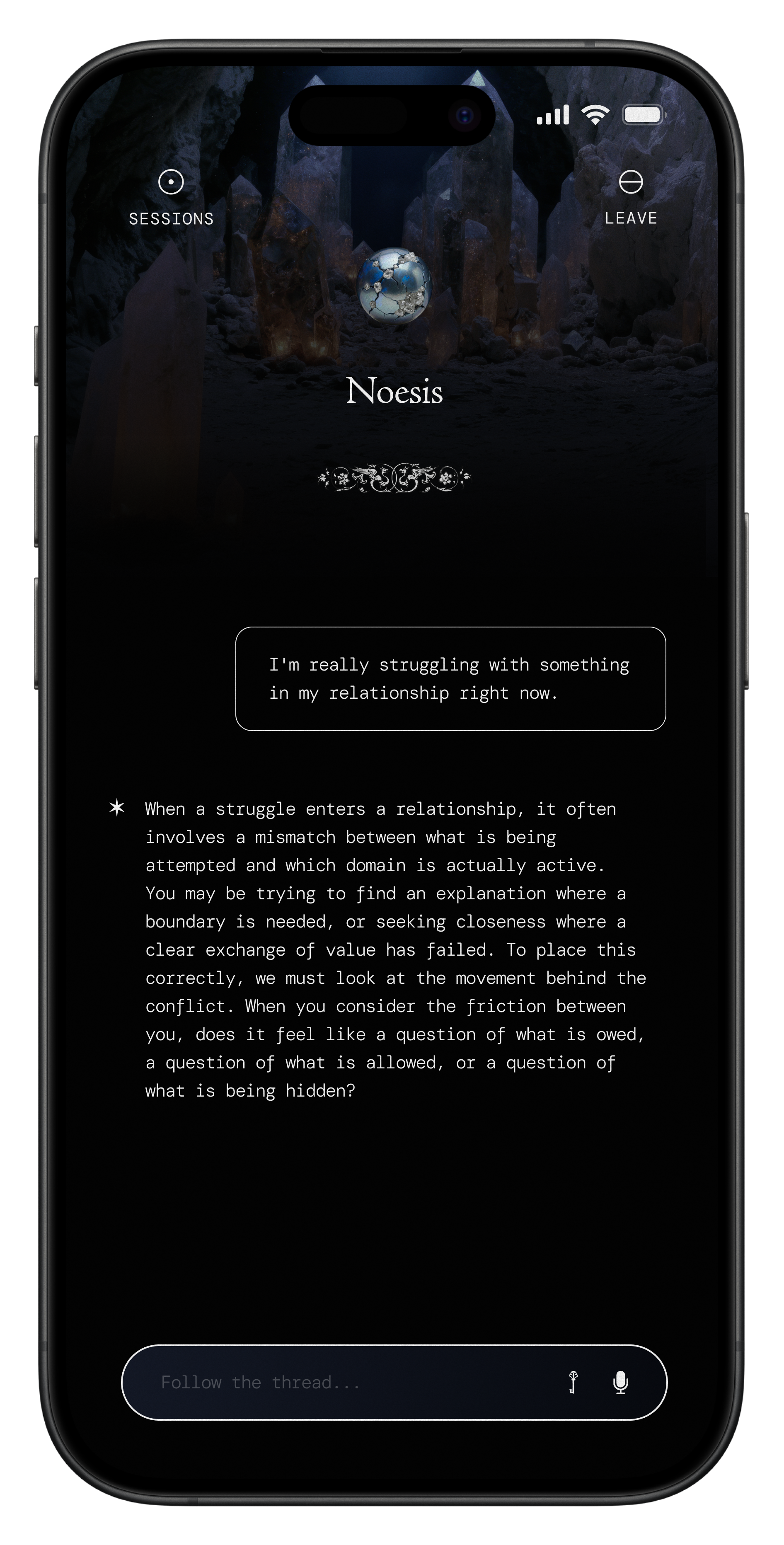 Many of our users described the experience as receiving exact, necessary tough love. We engineered this intelligence to introduce a specific kind of shock. It refuses to coddle your narrative. It completely denies you the comfort of validating your grievances. Noesis demands absolute responsibility for your own agency.