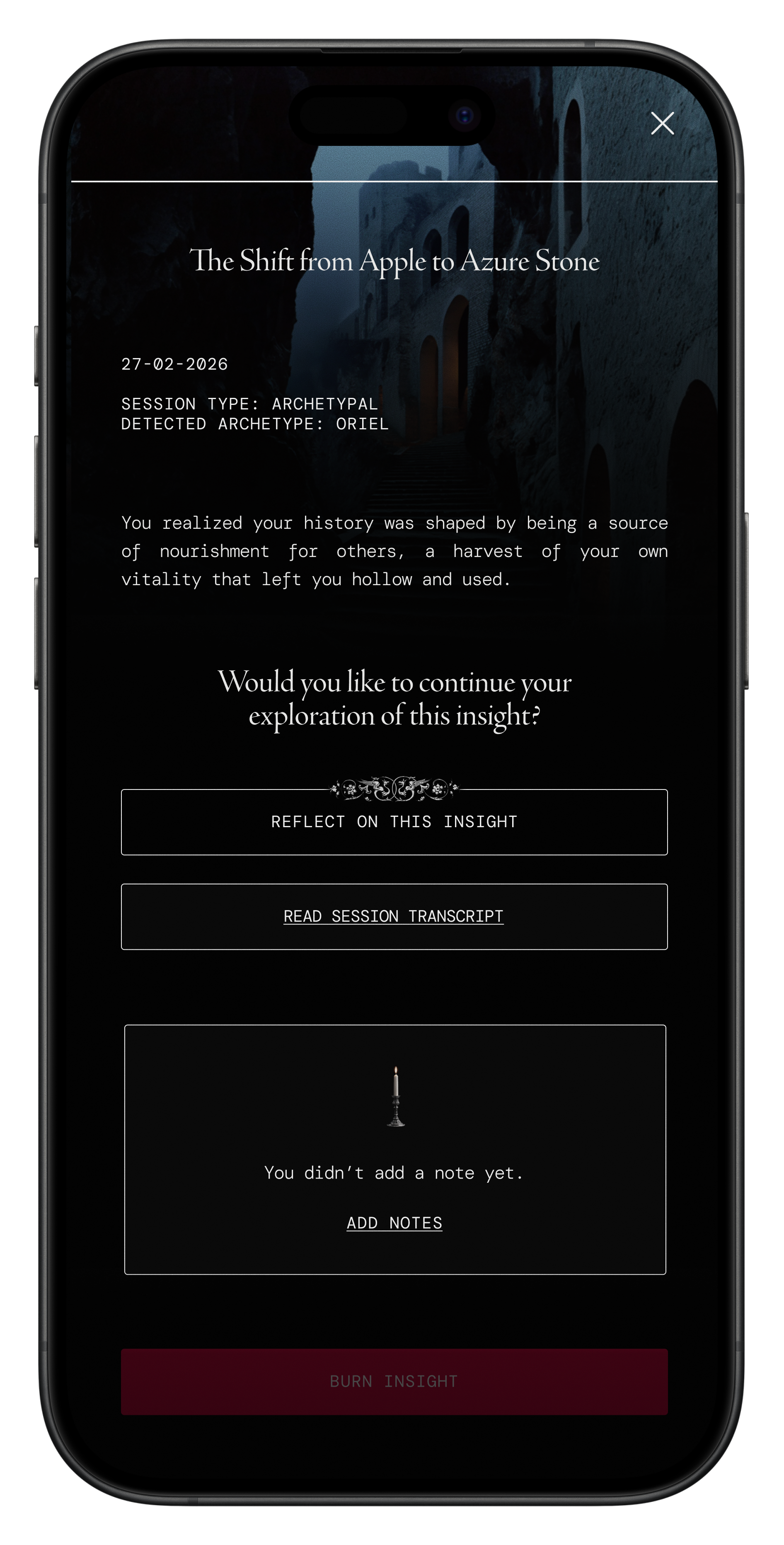 People use this feature in vastly different ways. You might want a highly charged, ritualistic cord-cutting session where you confront an archetype with raw frustration, knowing you want to wipe the exchange from existence the second you finish. Or you might just accidentally open a session by accident and want to get rid of it. Burning guarantees the interaction will never impact your archetypal constellation. When you burn a session, the data is completely irretrievable.