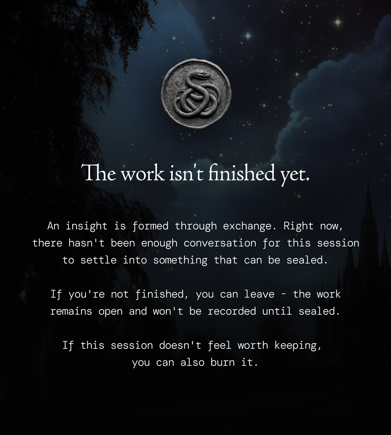 The archetypes will keep asking you questions throughout the engagement. You decide when the conversation is over. The idea is to seal the session the moment you hit a core truth. If you try to close the session out too soon, a screen will appear letting you know the work isn't finished yet. The system requires enough back-and-forth to actually generate a meaningful summary.