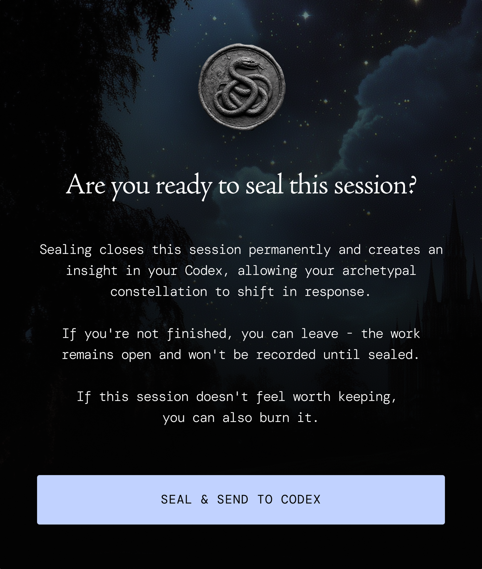 The act of sealing your sessions drives the entire backend of the app. Sealing allows the system to evaluate your interaction and update your archetypal constellation.