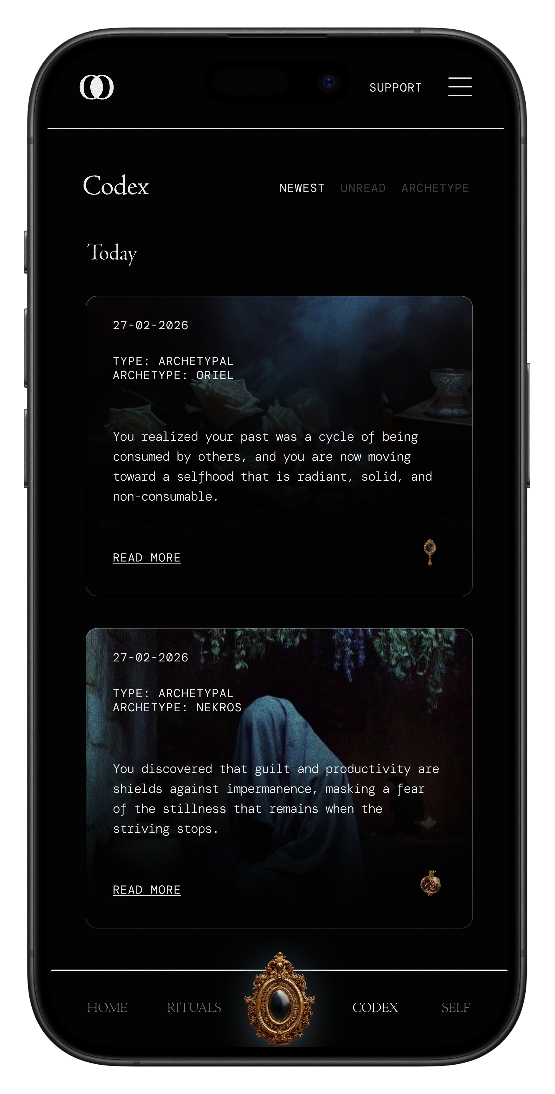 We built the Codex to solve the exact problems we just discussed. It serves as the permanent record of your inner life and the deep work you do within MOODS. Many people find it functions as a digital version of an alchemical journal or a magical diary — a place where your subconscious finally feels like it's being heard.